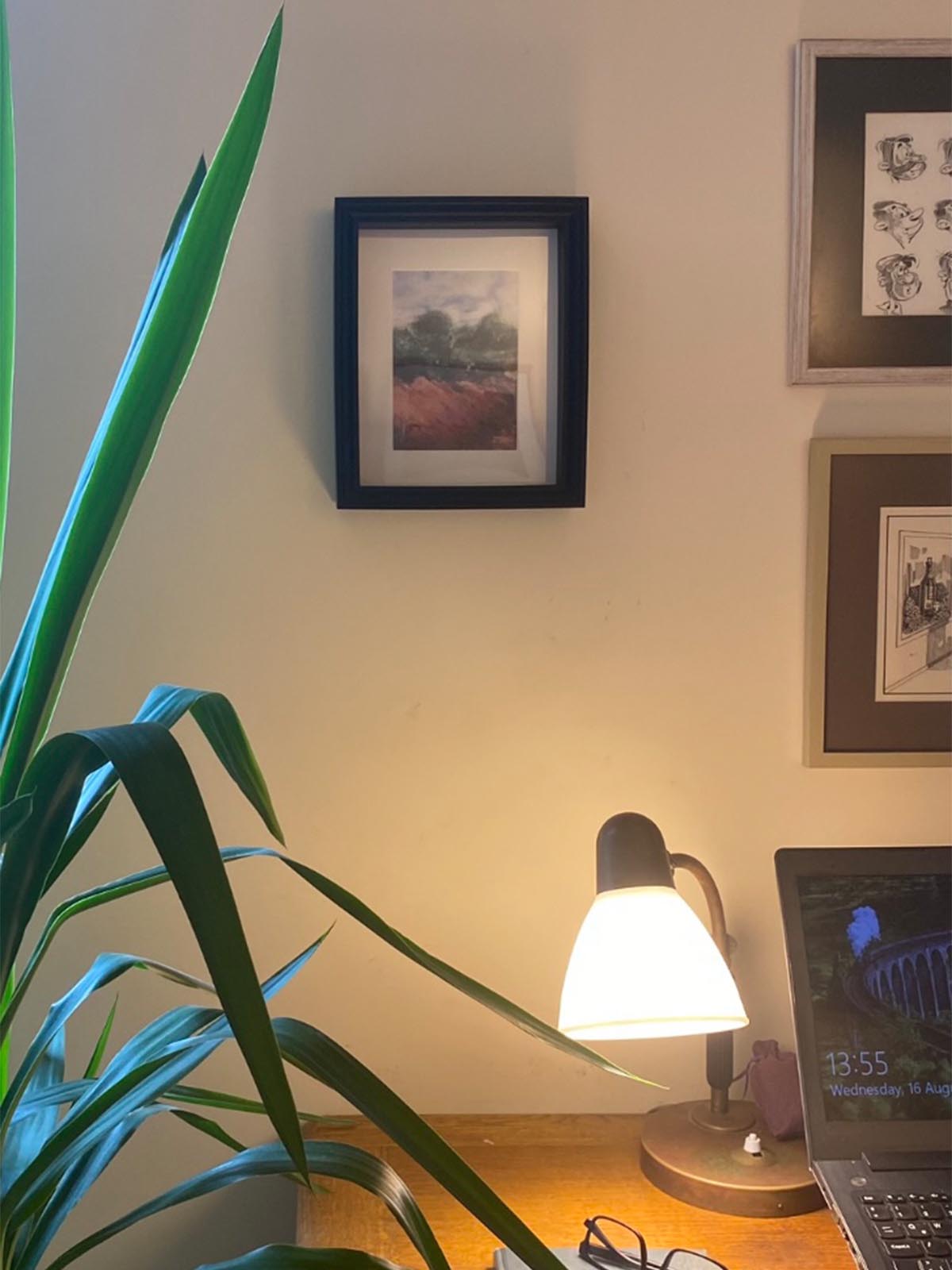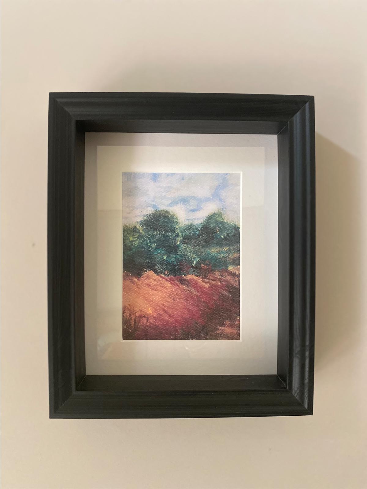 Sulu boya ve karışık teknikle yapılmış kır doğa resmi özel art print. Derinlikli siyah çerçeve ile boyut kazandırılmıştır.