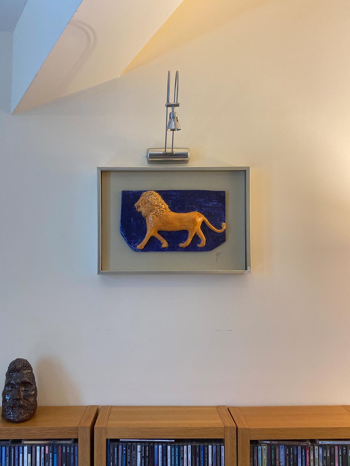 Antik ve her dönem gücü temsil eden aslan kontrast sarı mavi renkleriyle özel derinlilki metalik çerçeveli duvar rölyef